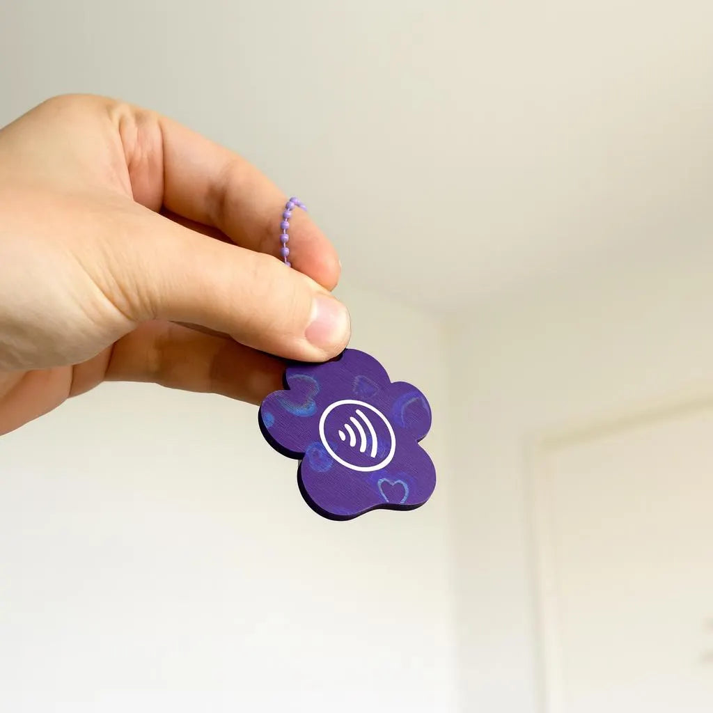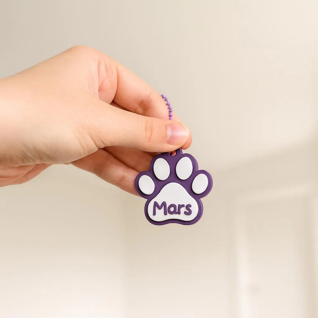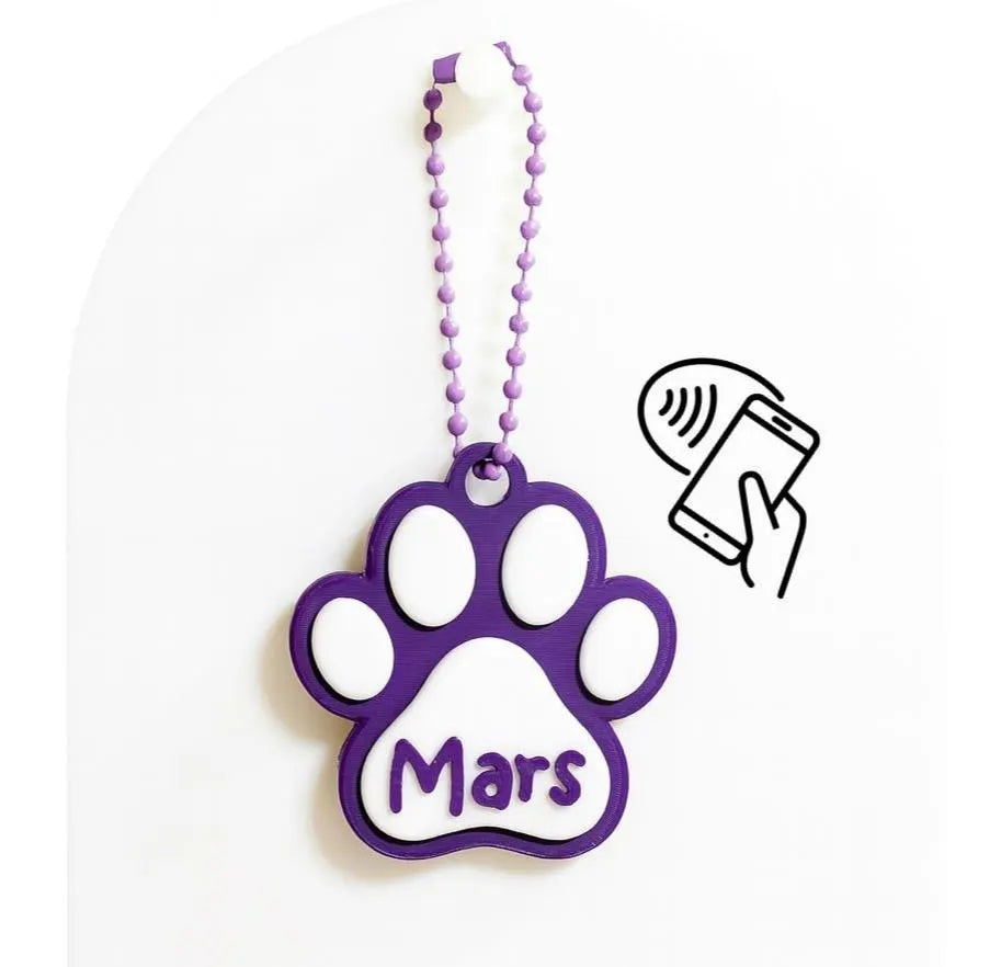 Keep your pet safe, stylish, and connected with this personalised NFC-enabled paw print pet tag. Designed in a striking purple and white colour scheme, this custom accessory is perfect for both dogs and cats.